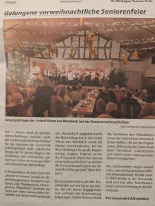 Dem Aufruf anlässlich der bundesweiten „Woche der offenen Chöre“ des Deutschen Chorverbands sind fünf interessierte Sängerinnen aus Schlangenbad und den umliegenden Gemeinden gefolgt. Auch die aktiven Sängerinnen kommen derzeit nicht nur aus Schlangenbad und seinen verschiedenen Ortsteilen, sondern auch aus Taunusstein, Bad Schwalbach sowie den Wiesbadener Stadtteilen Igstadt, Sonnenberg und Südost. Bei den United Voices treffen sich dienstags abends Frauen jeden Alters und Wohnort, um mit viel Spaß und in entspannter Atmosphäre gemeinsam zu Singen.