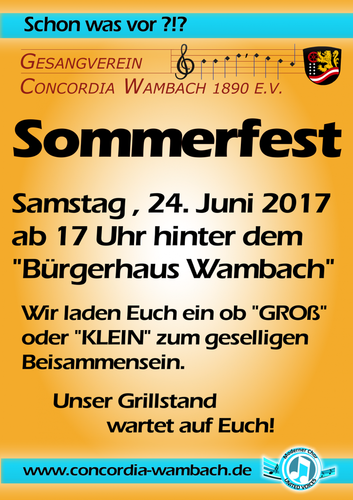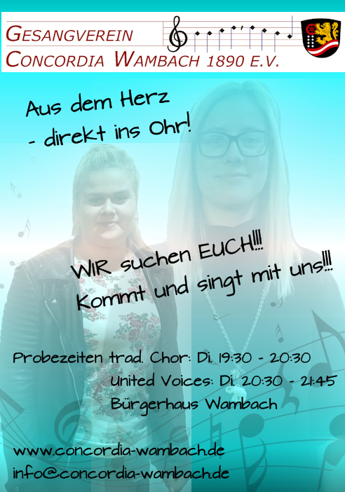 Wir suchen EUCH! Die Concordia macht sich pünktlich zum Herbstbeginn auf Mitgliedersuche. Am 21.10.2017 werden wir in Wambach und Umgebung unseren Verein vorstellen oder in Erinnerung rufen. Das bedeutet – wir kommen zu EUCH. Von Haustür zu Haustür werden wir mit dem Einen oder Anderen das Gespräch suchen 🙂 Vielleicht habt Ihr danach Lust uns EURE Stimme zu schenken! Wir freuen uns auf EUCH.